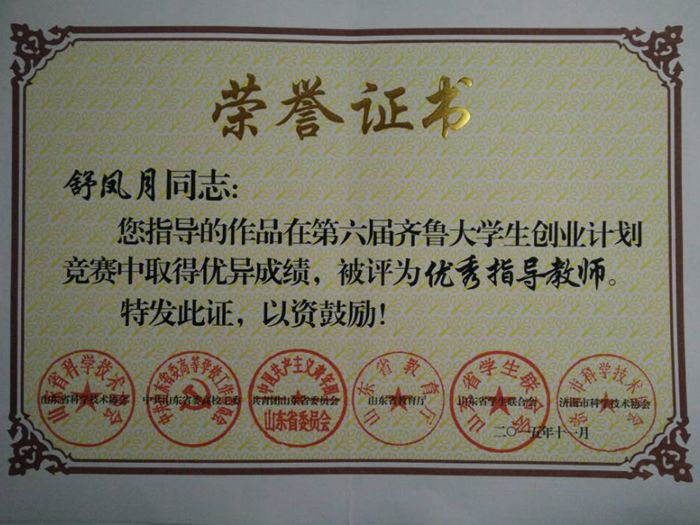 舒凤月老师获第六届齐鲁大学生创业大赛“优秀指导教师”荣誉称号。